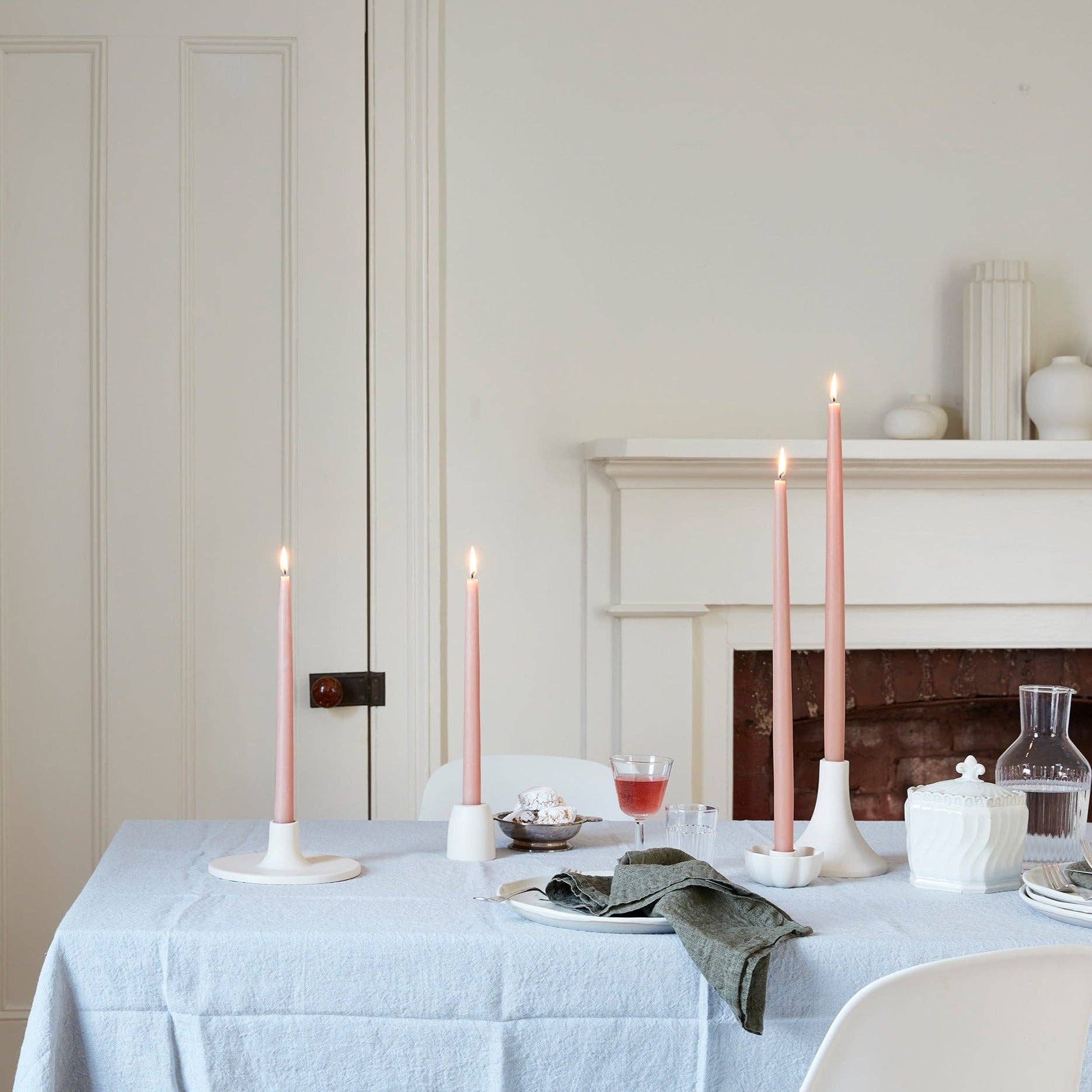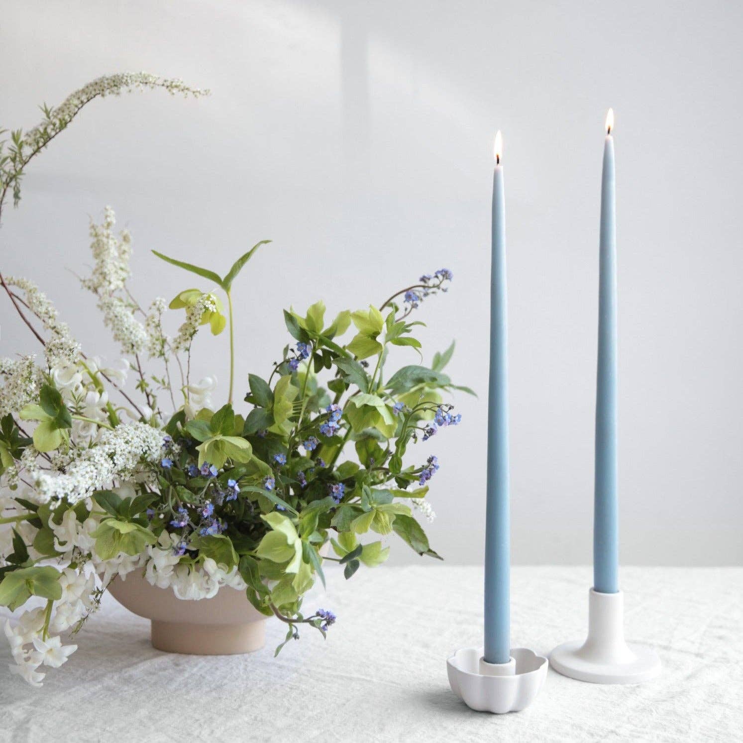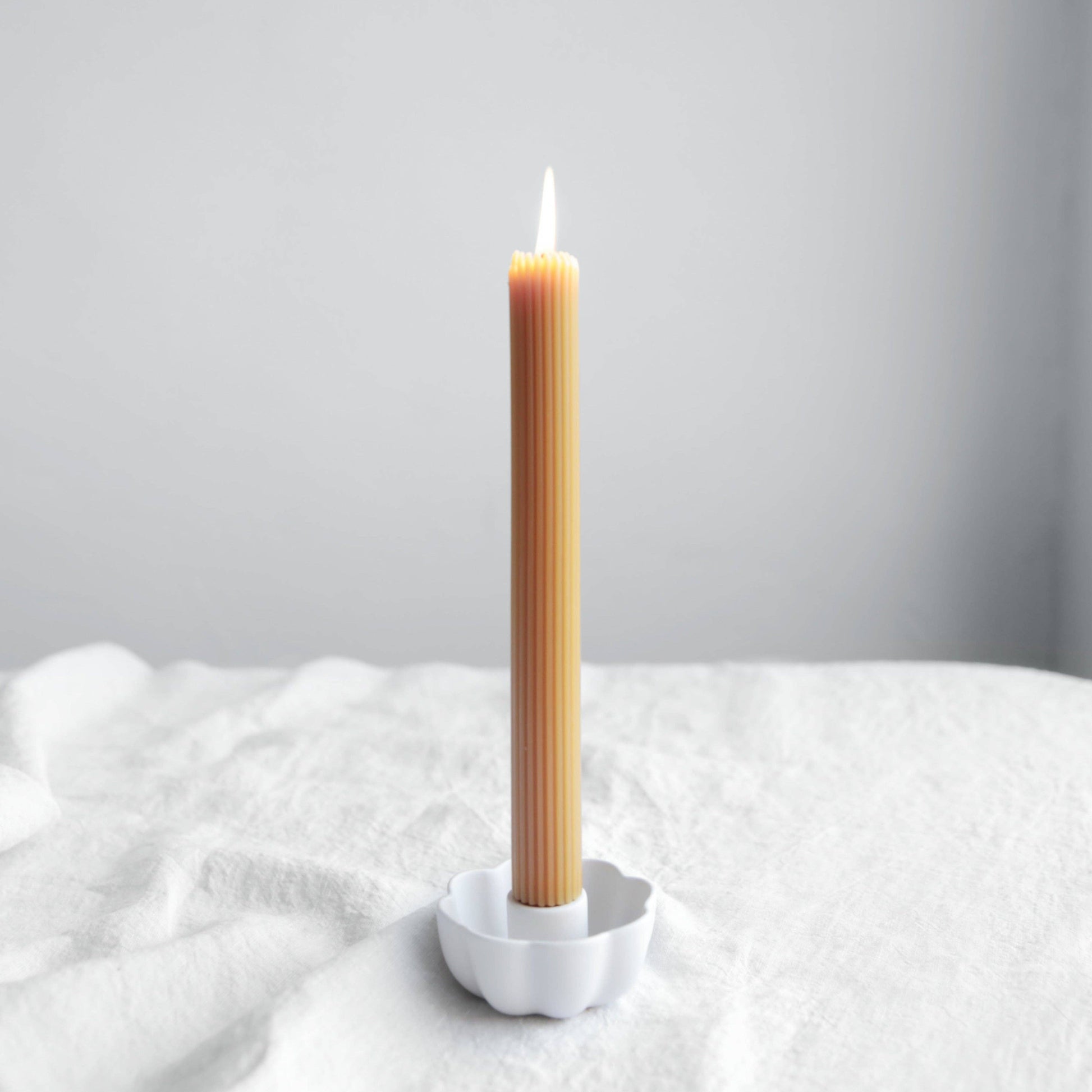 Featuring a scalloped edge that adds softness and modernity, the Fleur Taper Holder is as beautiful as it is functional. The blossoming petal shape, raised rim and natural, matte-white finish is a fresh variation in shape and form. The holder is sized to fit a standard taper candle and pairs perfectly with the classic white ceramics in our collection.