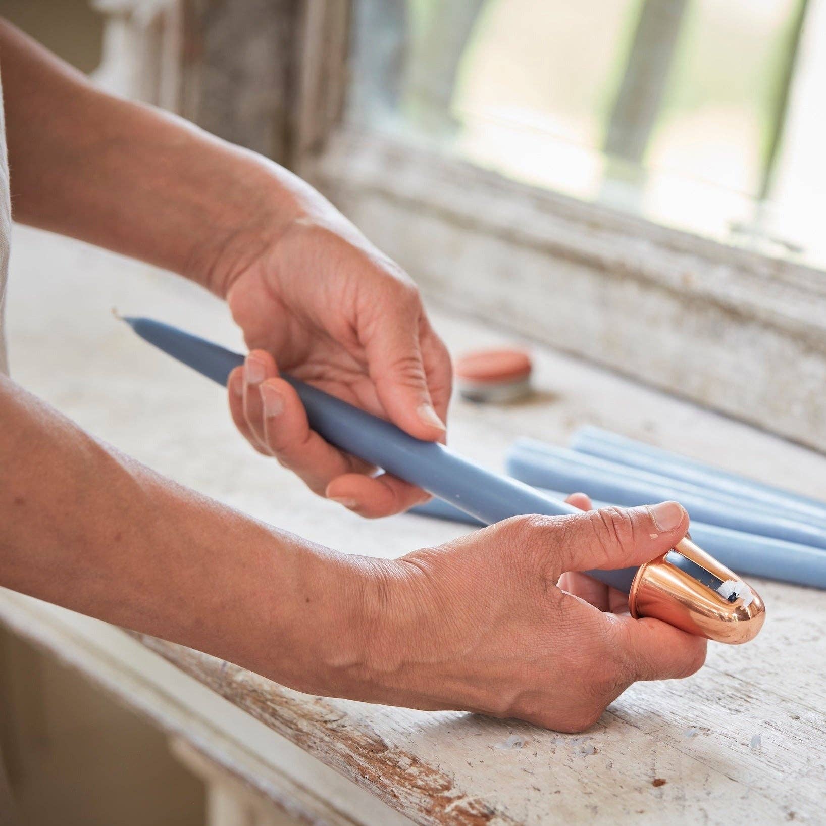The perfect tool for shaping taper candles to fit into any holder. Gently shave away a thin layer of wax from the base of the candle until a desired diameter is reached. Handmade and solid copper.
