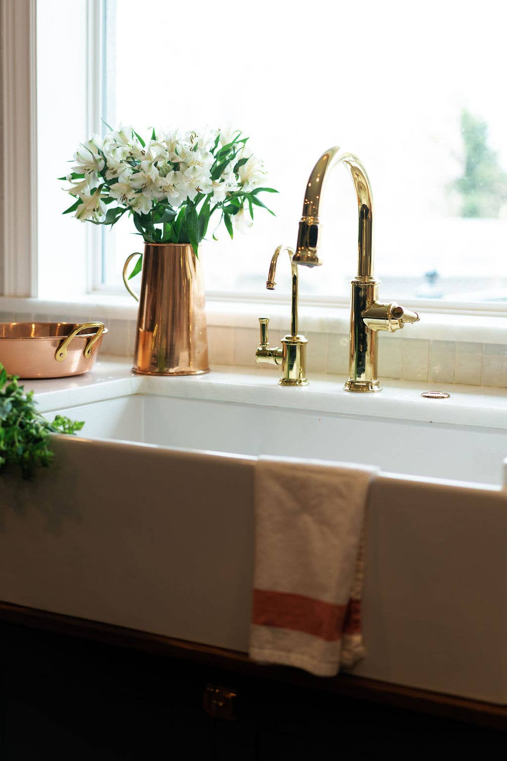 A copper water pitcher that doubles as flower vase. If it doesn't belong in a cottage kitchen, it doesn't belong in your kitchen. With that as our model, we designed our water jug of 100% copper, with a brass handle. Whether keeping your favorite beverage chilled, or acting as a vase for fresh flowers, this charming copper jug should be an essential part of your kitchen. Dimensions: 9.5" x 6". 100% pure copper featuring a brass handle.