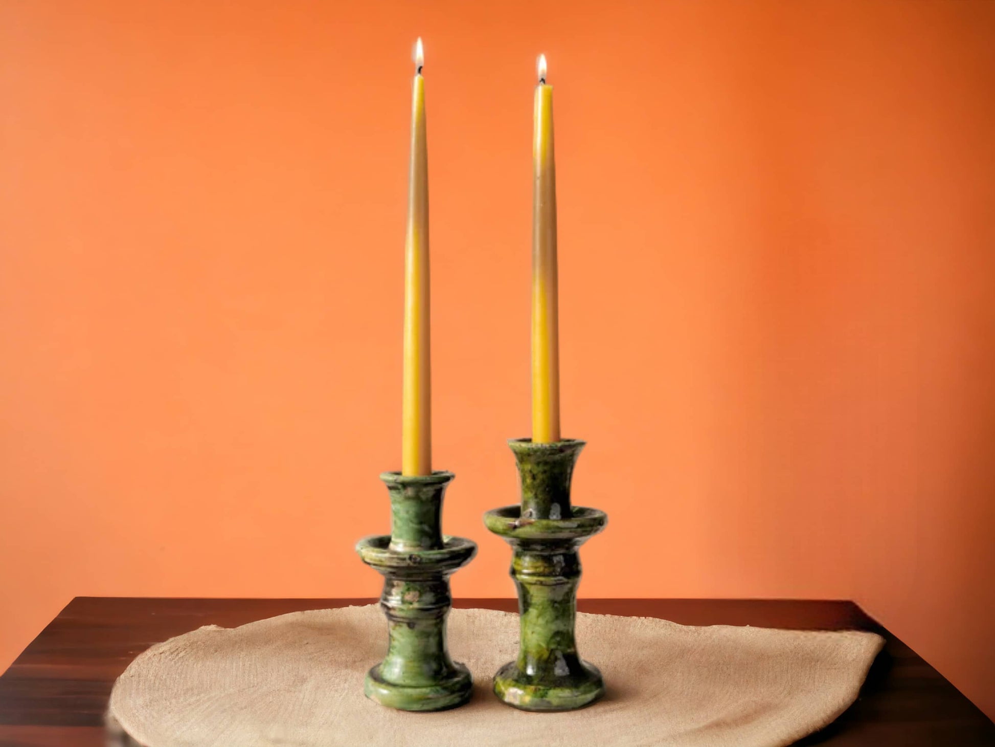 Illuminate your dining experience with our vintage Tamegroute green candlestick holders, each one a unique masterpiece. Crafted by skilled artisans, these candlesticks boast a distinct tapered shape, lovingly formed by hand. The mesmerizing mid-toned green hue is achieved through a special glazing technique, making each piece a work of art.
